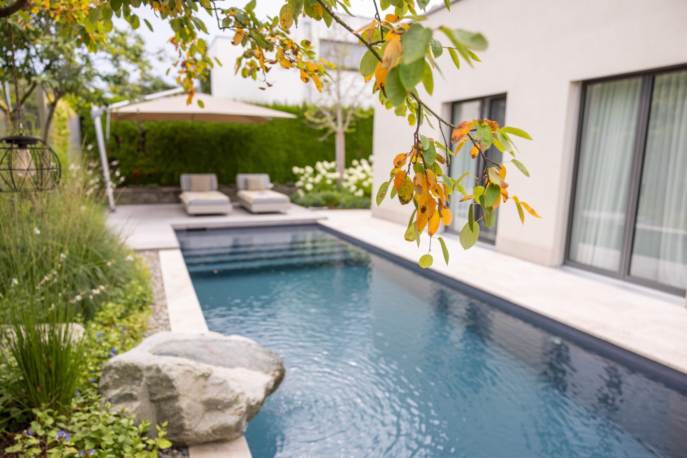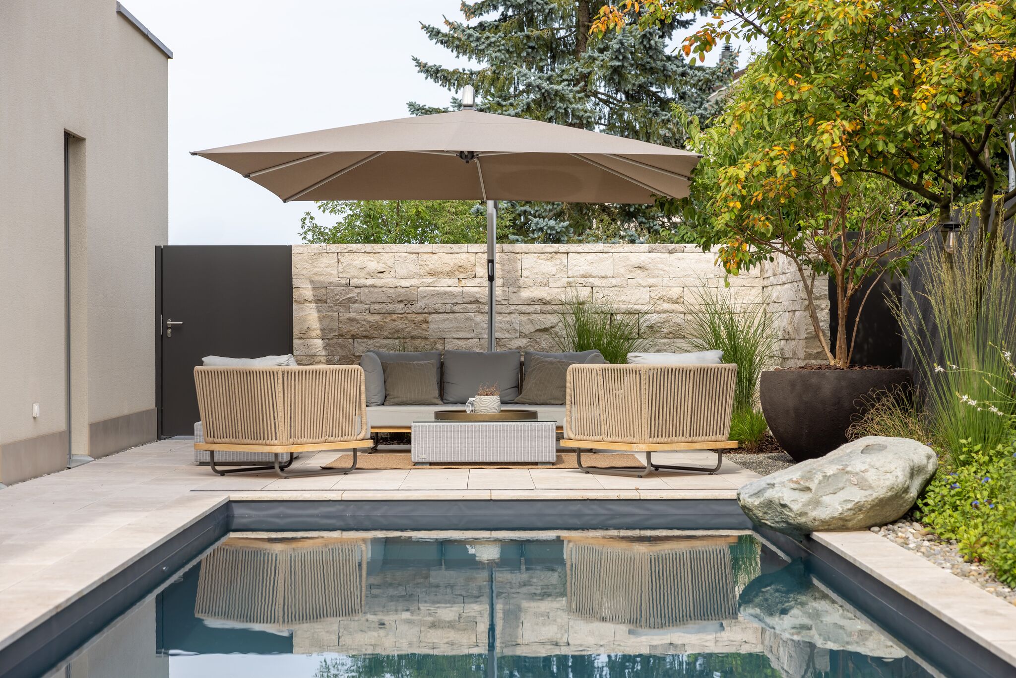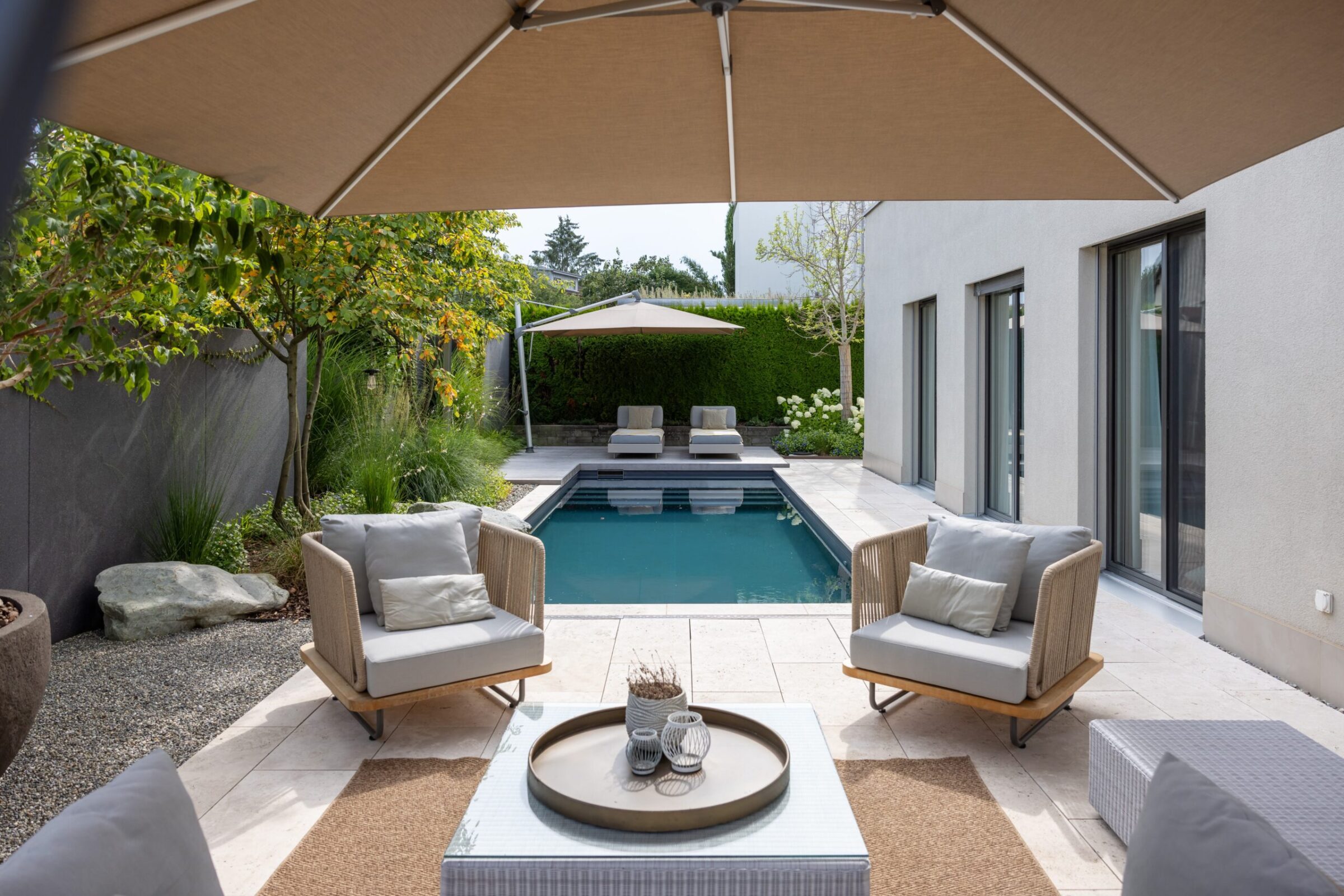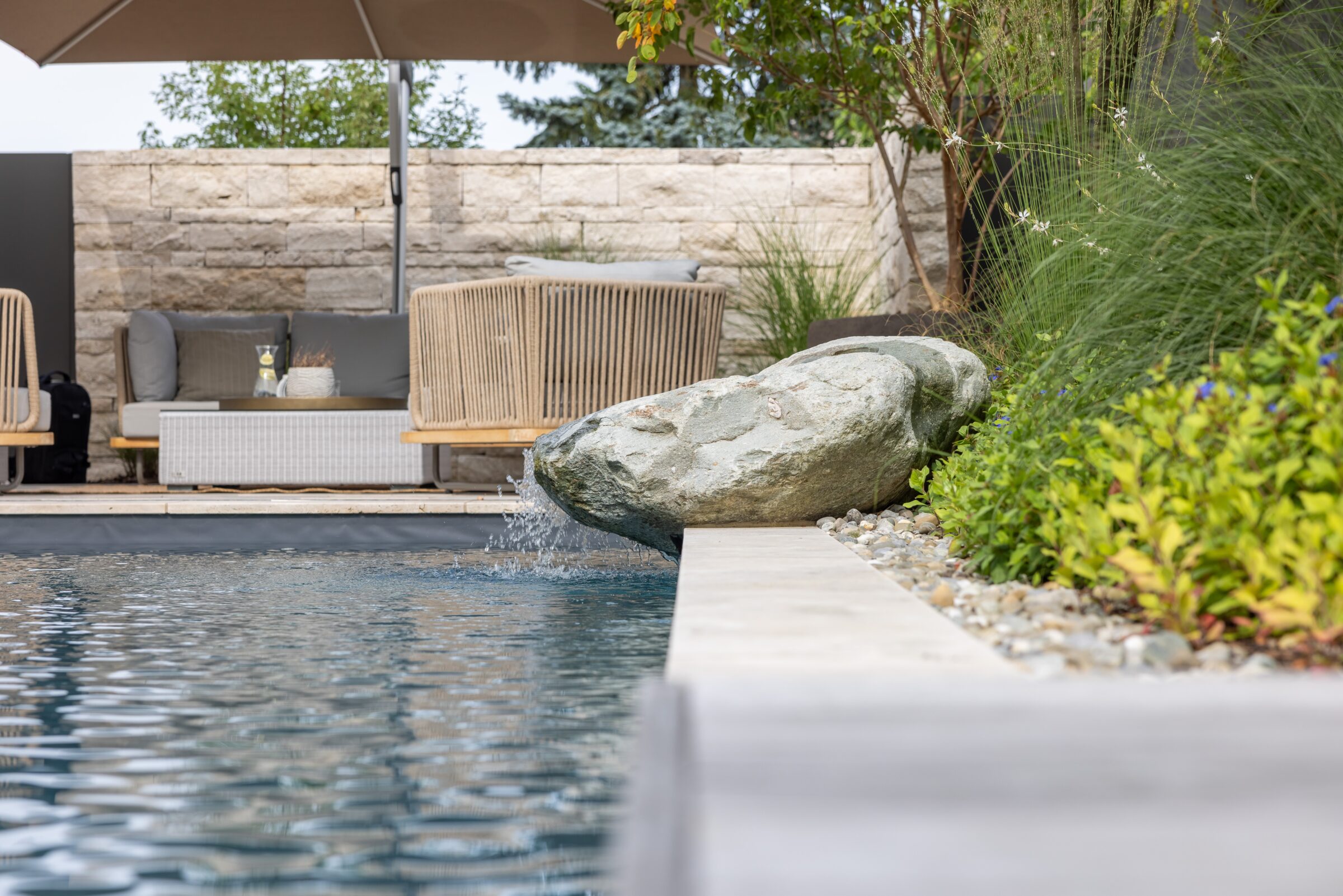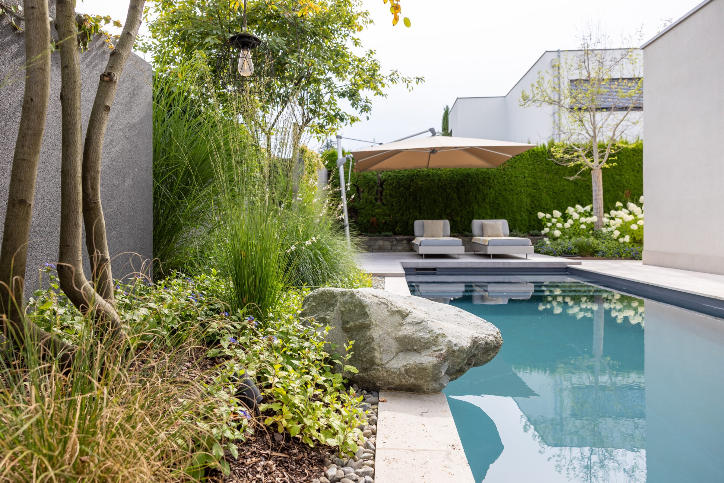 Dieses Gartenprojekt zeigt eindrucksvoll, wie durch kreative Gestaltung und eine kluge Raumaufteilung selbst auf kleinem Raum ein stilvoller Rückzugsort entstehen kann. Der Fokus liegt dabei klar auf dem zentral gelegenen Biopool, der zum Herzstück des Gartens wird. An einer Seite des Pools lädt ein Holzdeck mit direktem Zugang zum Wasser zum Entspannen ein. Auf der gegenüberliegenden Seite befindet sich ein mit Travertin belegter Platz, der genügend Raum für eine grosszügige Lounge bietet.
