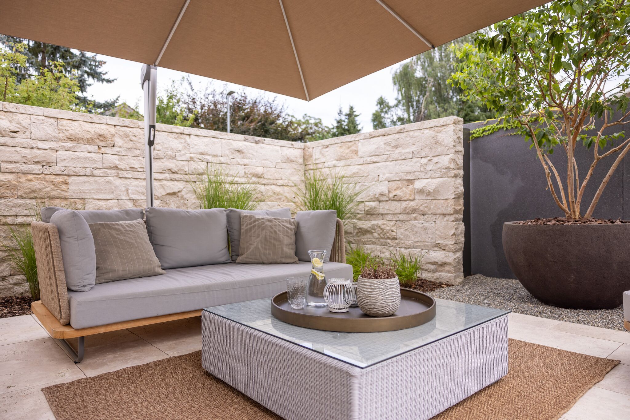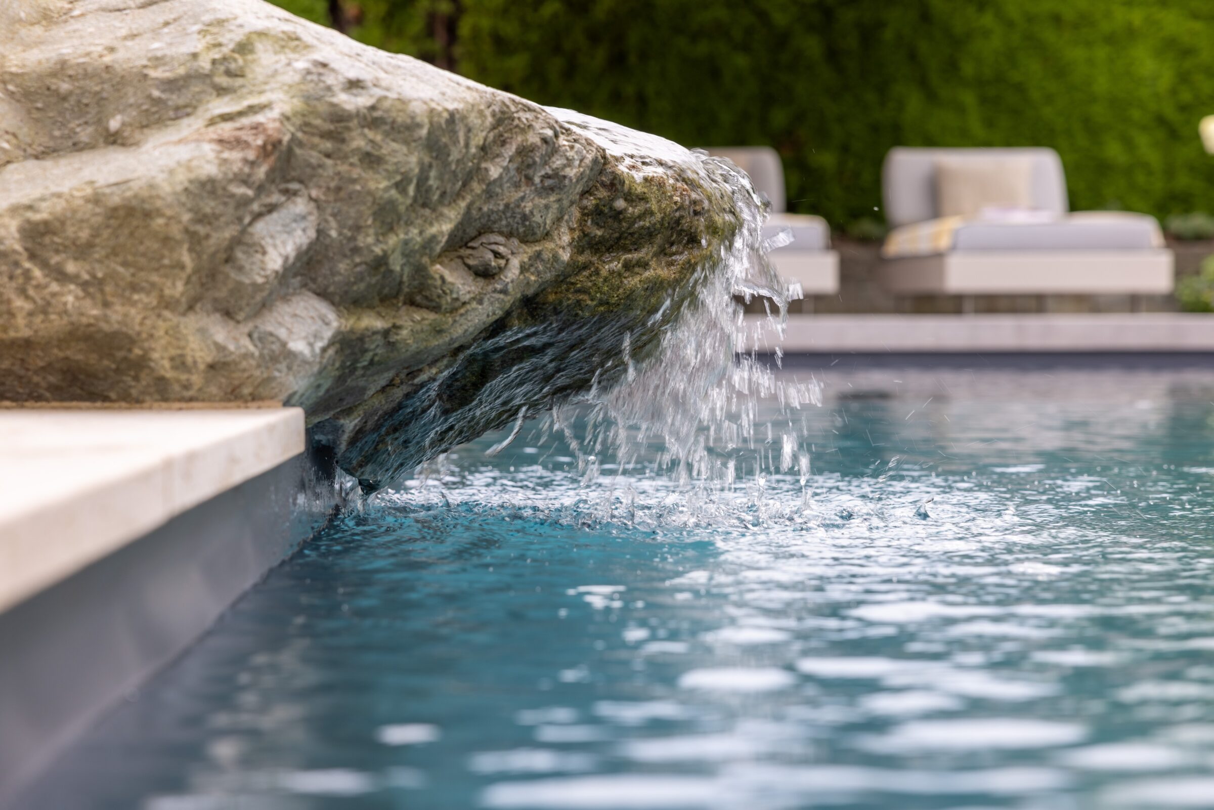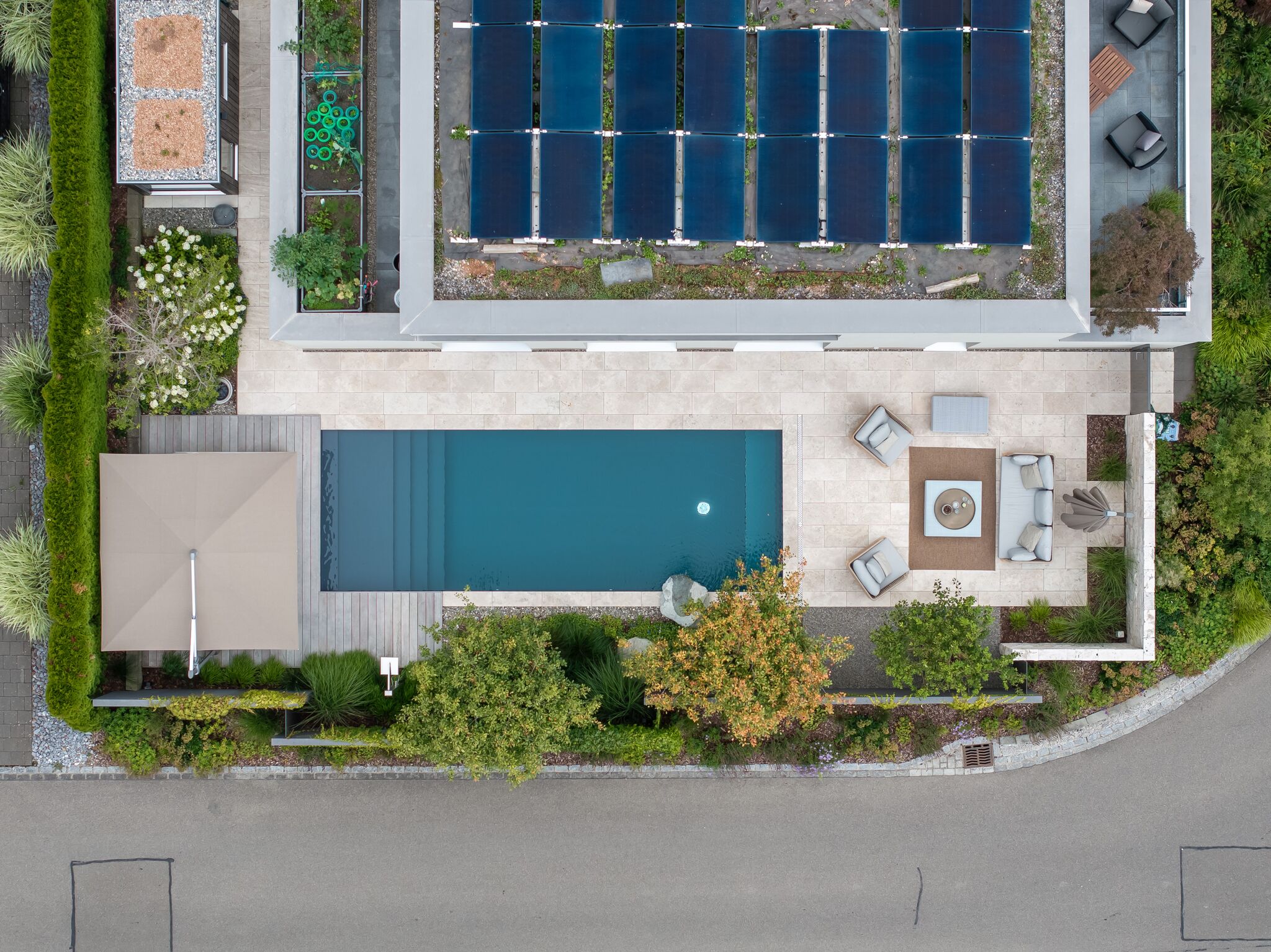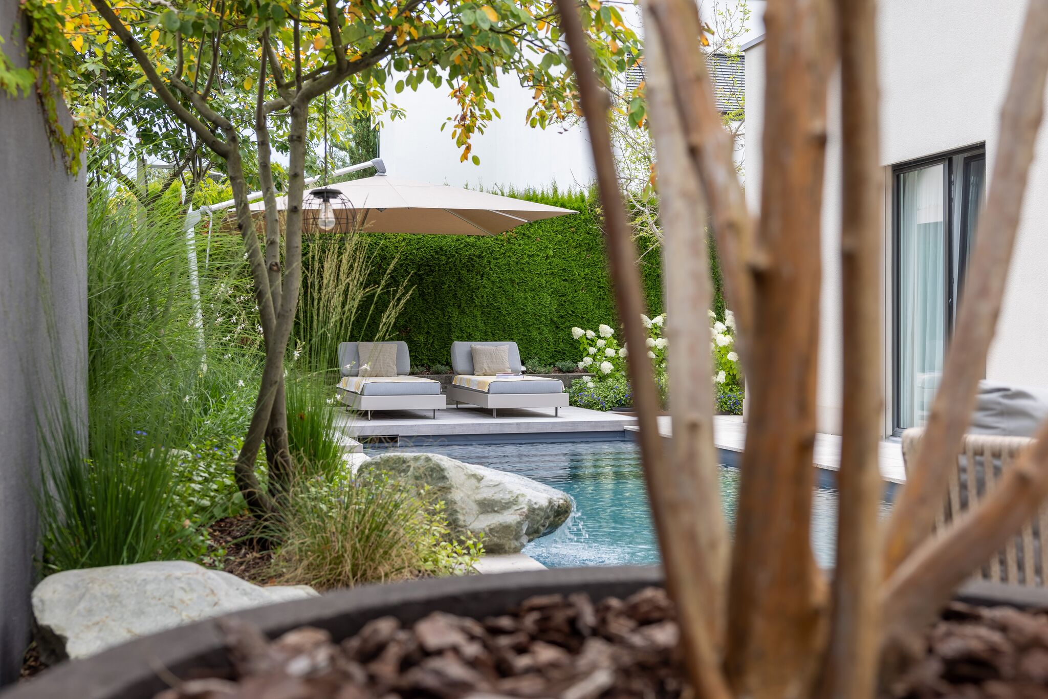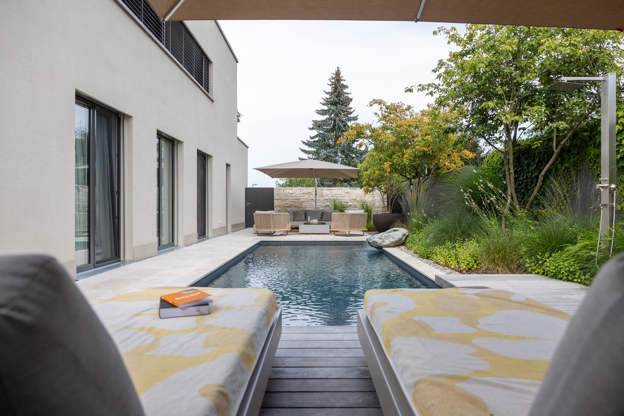 Dieses Gartenprojekt zeigt eindrucksvoll, wie durch kreative Gestaltung und eine kluge Raumaufteilung selbst auf kleinem Raum ein stilvoller Rückzugsort entstehen kann. Der Fokus liegt dabei klar auf dem zentral gelegenen Biopool, der zum Herzstück des Gartens wird. An einer Seite des Pools lädt ein Holzdeck mit direktem Zugang zum Wasser zum Entspannen ein. Auf der gegenüberliegenden Seite befindet sich ein mit Travertin belegter Platz, der genügend Raum für eine grosszügige Lounge bietet.