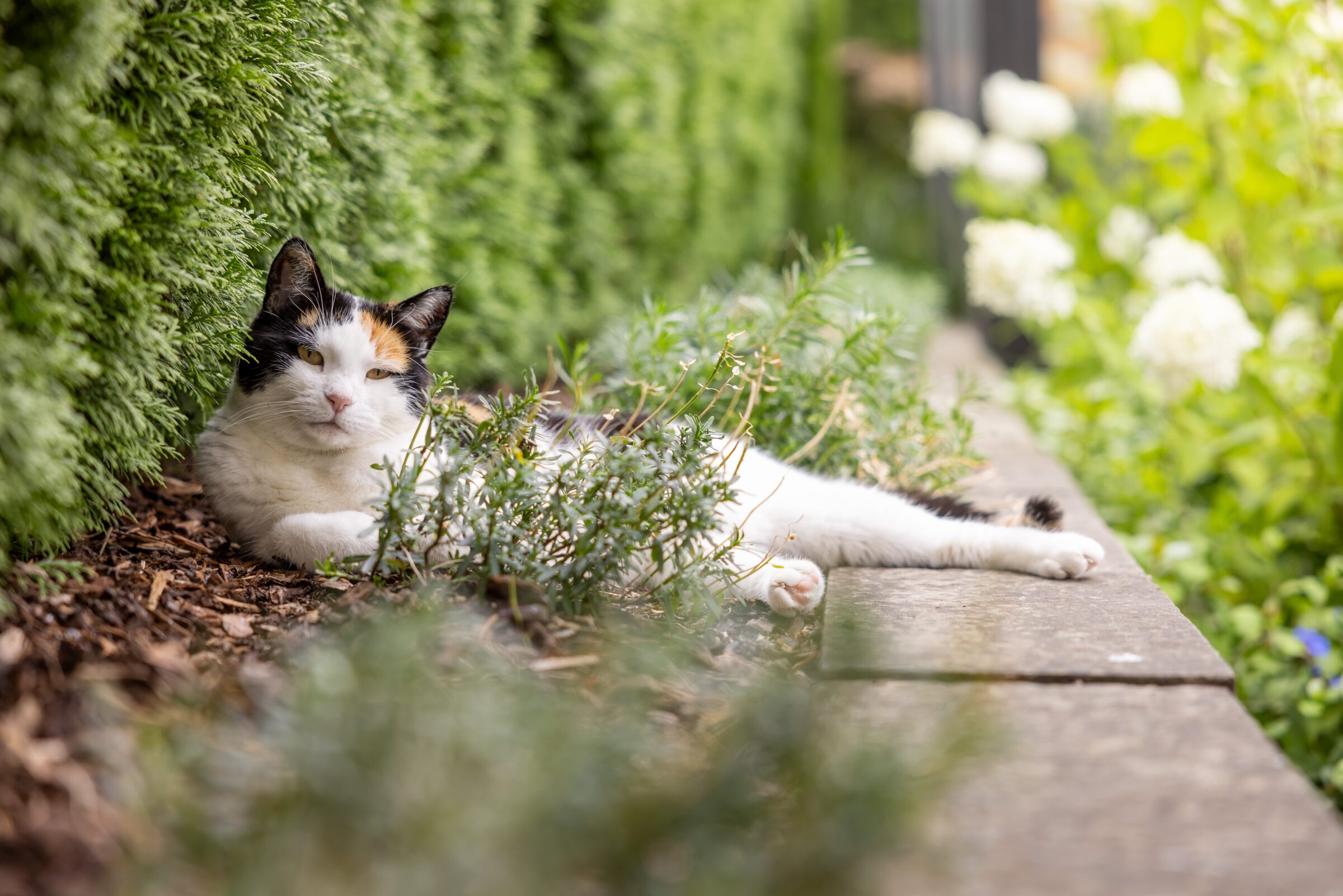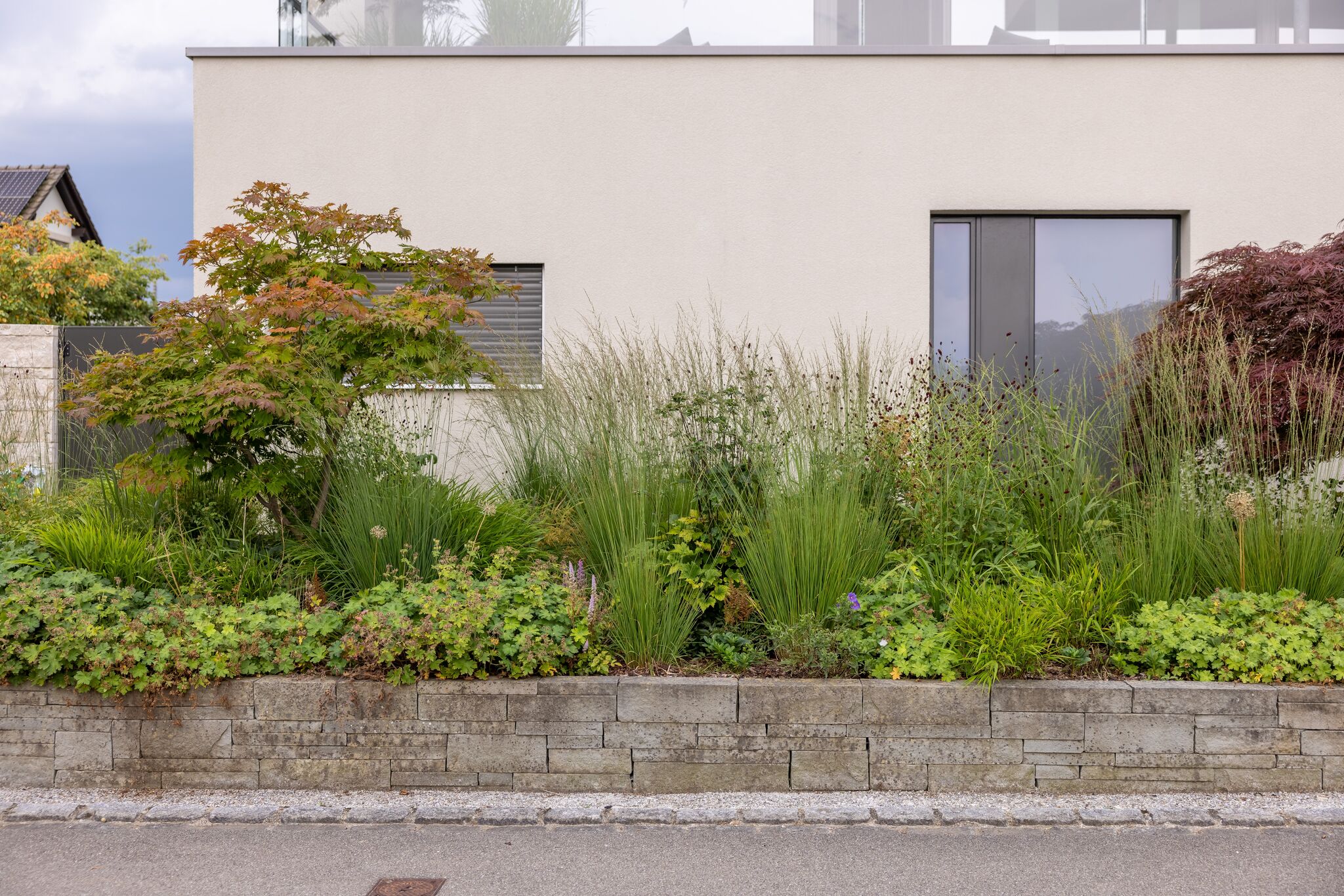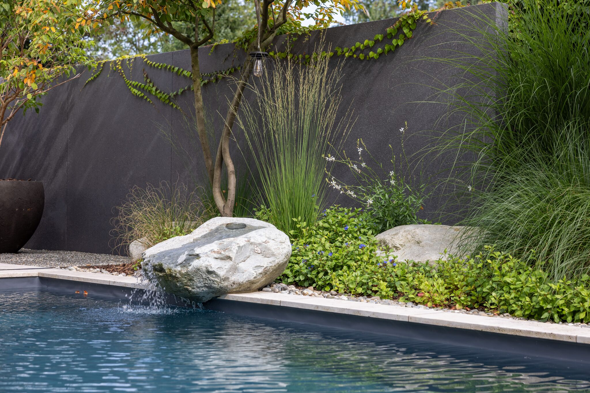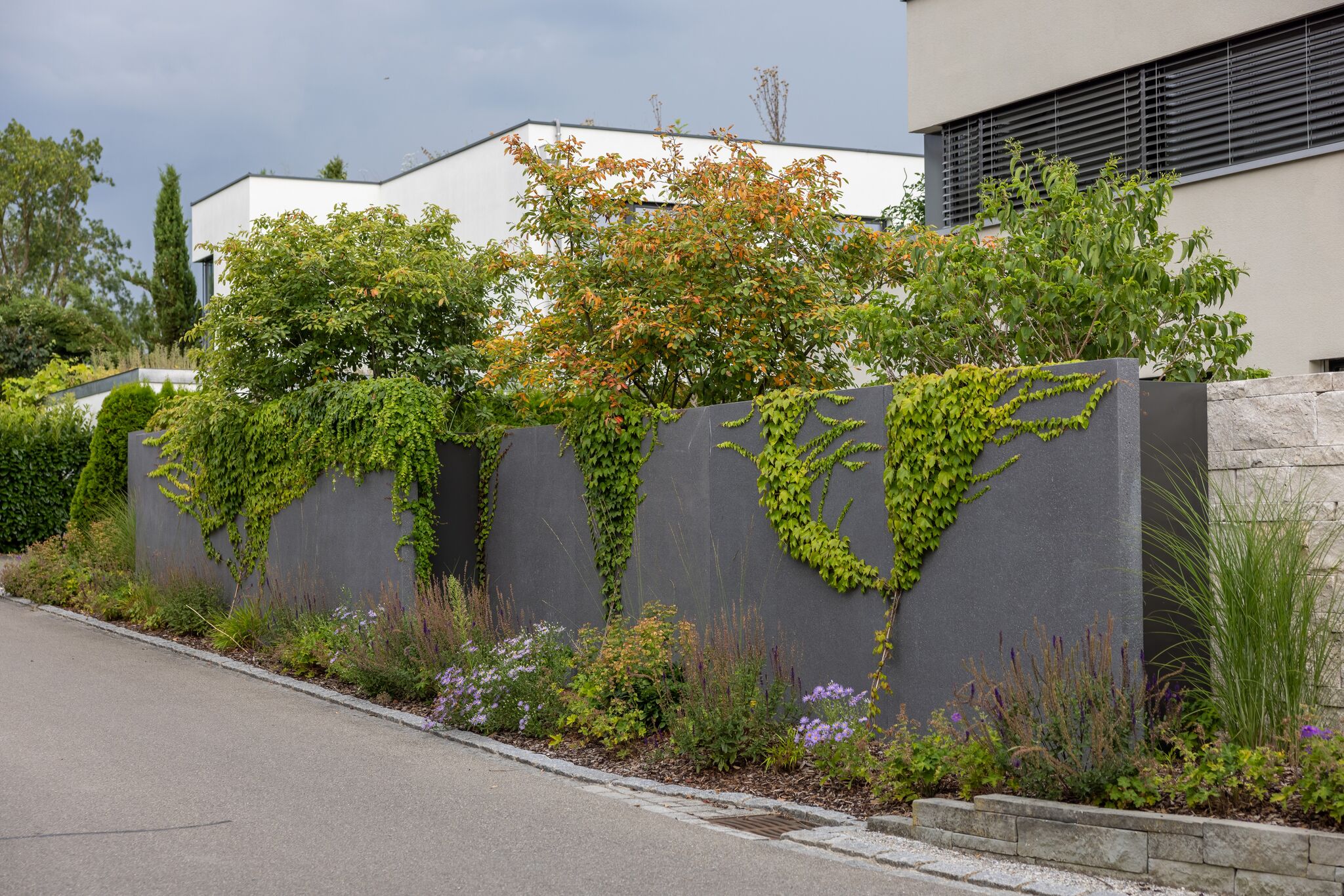 Üppig bepflanzte Mauern aus verschiedenen Materialien fassen den Garten sanft ein und schützen ihn zugleich vor unerwünschten Blicken. Durch das gezielte Versetzen der Mauerelemente entsteht ein spannendes Spiel mit Tiefe und Perspektive, das die klaren Linien des Entwurfs bewusst auflockert. Die Bepflanzung trägt ebenfalls wesentlich zum besonderen Raumgefühl bei. Sie entfaltet sich visuell vom Inneren nach aussen, löst die Strenge der Architektur auf und schafft eine harmonische Verbindung zwischen den einzelnen Bereichen.