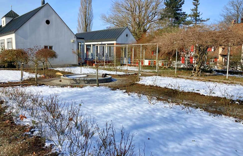 Im Winter waren die Reihen an Rosensträuchern in diesem Garten, die den schneebedeckten Rasen vom grobkörnigen, dunklen Kiesweg trennten, noch lückenhaft. Einige der bestehenden Pflanzen waren über die Jahre eingegangen. Der Buchspilz hatte zudem die Buchshecken befallen. Und als wäre das nicht genug, hatte sich der Buchsbaumzünsler darin eingenistet. Seine Raupen machen sich im Frühjahr regelmässig mit grosser Gefrässigkeit über das Grün der Hecken her.